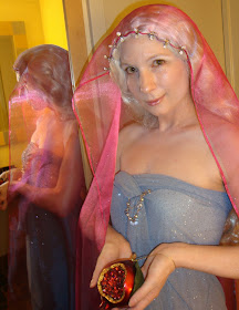 On Friday night, the Mythos Masquerade was held in mythic splendour. I could not, of course, pass up an opportunity to dabble in my own mythology and portray my version of The Goddess Persephone as I have envisioned her in The Perilous Prophecy of Guard and Goddess. She turned out fairly well if I do say so myself, pretty much just the way I hoped (save for all the special effects that would, as I've described her, have her shifting and shimmering colours all the time).